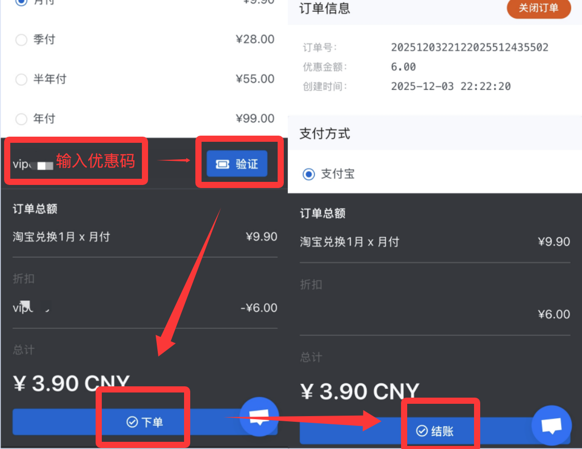 点网站购买订阅 >> 选择 淘宝兑换1月的套餐 >> 把优惠券输入,点验证,然后点下面下单,再点结账 >> 付款完成后,返回网站,点查看教程下载软件 。如下图所示: